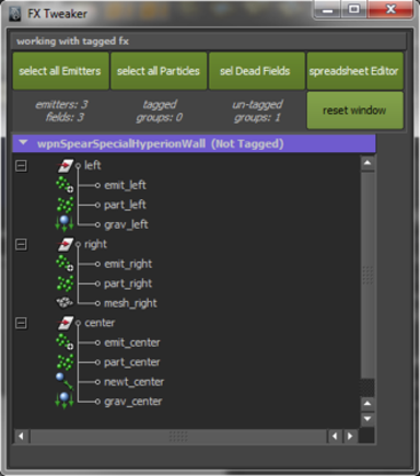 fXTweaker - an outliner tool that shows only particle related nodes and information. Used for node optimizations and quick selections in a scene that contains thousands of nodes.