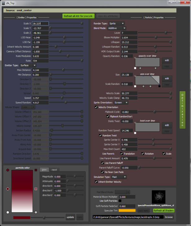 sfxToy - a real-time fx tool to streamline the creation and manipulation of Maya generated particles inside of the existing Sony game art pipeline.